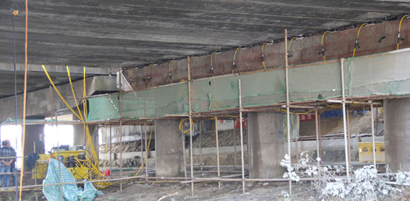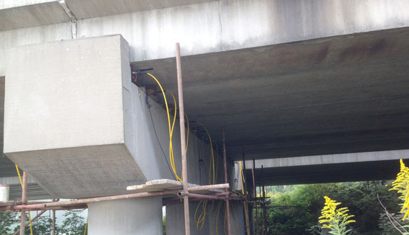 江廣高速公路改造工程JG-GG-2標許莊周梓中溝中橋,采用同步千斤頂104臺將原有橋梁抬高50mm及舊支座進行更換,此項目為泰州市重點城建項目、國家高速主干道京滬高速江都至廣陵段(簡稱江廣高速)改擴建工程, 此次工程將對該橋進行拼寬拓孔,即在原有位置往東側增加4孔,加長86米。